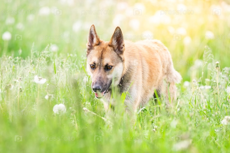 Дворняга рыжего окраса на траве. Лето