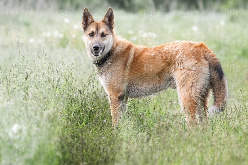 Дворняга рыжего окраса на траве. Лето
