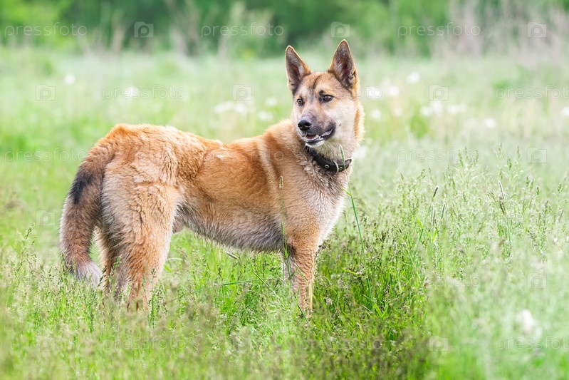 Дворняга рыжего окраса на траве. Лето