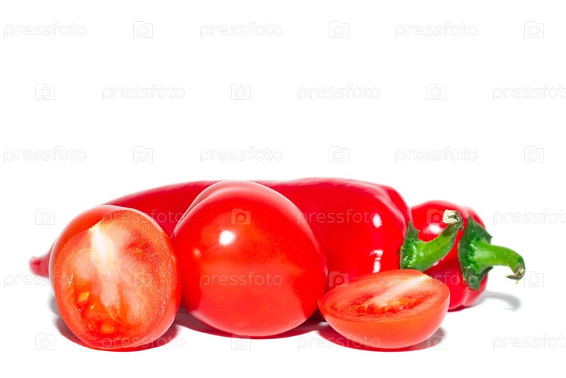 Красный сладкий перец сорта Рамиро и томаты на белом фоне