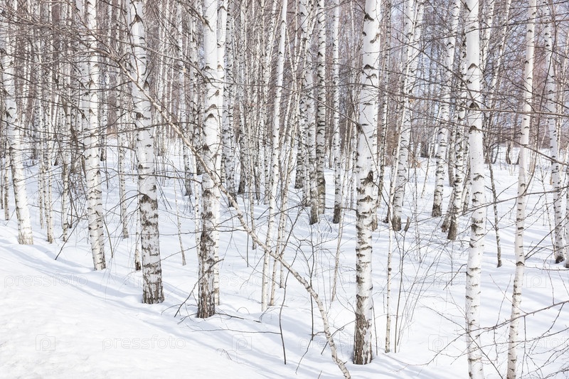 Молодые березы с черно-белой корой зимой в березовой роще на фоне других берез