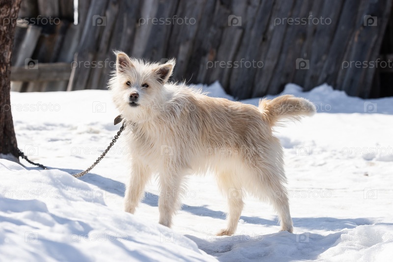 Портрет большой белой собаки смешанной породы на цепи на зимнем белом фоне