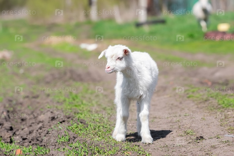 Белый козленок на зеленой траве у дороги в солнечный день