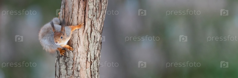 Рыжая белка сидит на ветке дерева в зимнем лесу и грызет семена на фоне заснеженных деревьев
