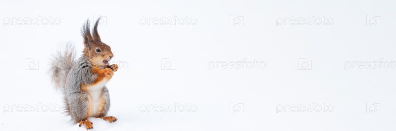 Рыжая белка сидит на ветке дерева в зимнем лесу и грызет семена на фоне заснеженных деревьев