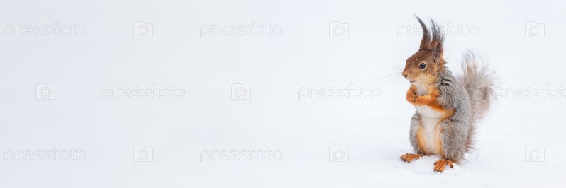 Рыжая белка сидит на ветке дерева в зимнем лесу и грызет семена на фоне заснеженных деревьев