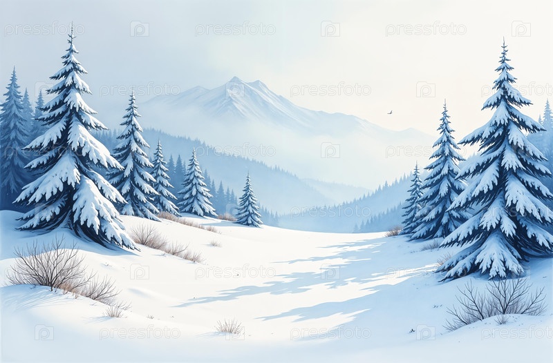 Зимний лесной пейзаж, светит солнце, деревья стоят в снегу. Сгенерировано ИИ