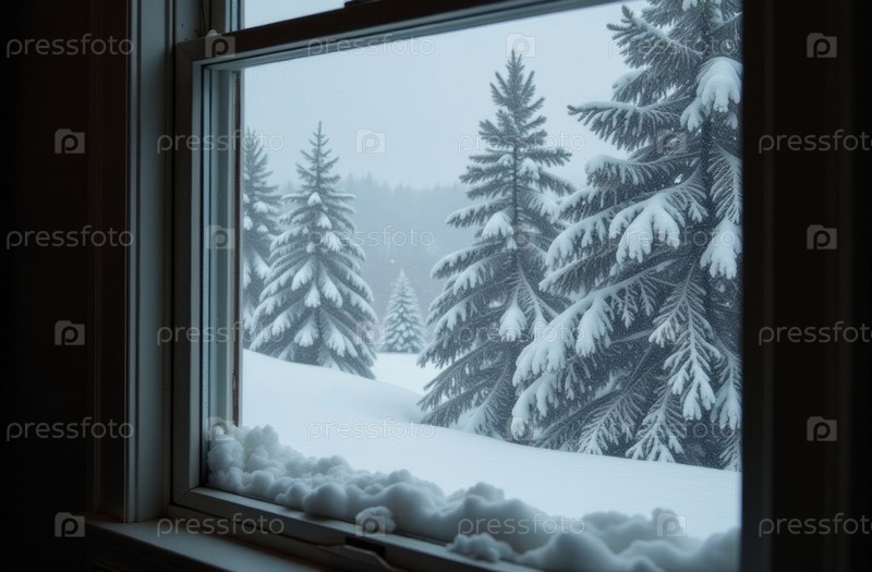 Подоконник внутри дома, за окном зима, новогодняя елка. Создано с помощью искусственного интеллекта