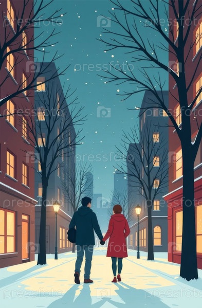 Мужчина и женщина гуляют по зимнему городу, пара гуляет по заснеженной улице, вечер. Создано искусственным интеллектом