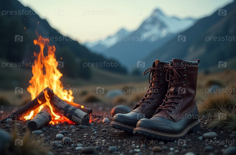 Походные ботинки сушатся у костра, палаточный лагерь в горах. Генеративный искусственный интеллект