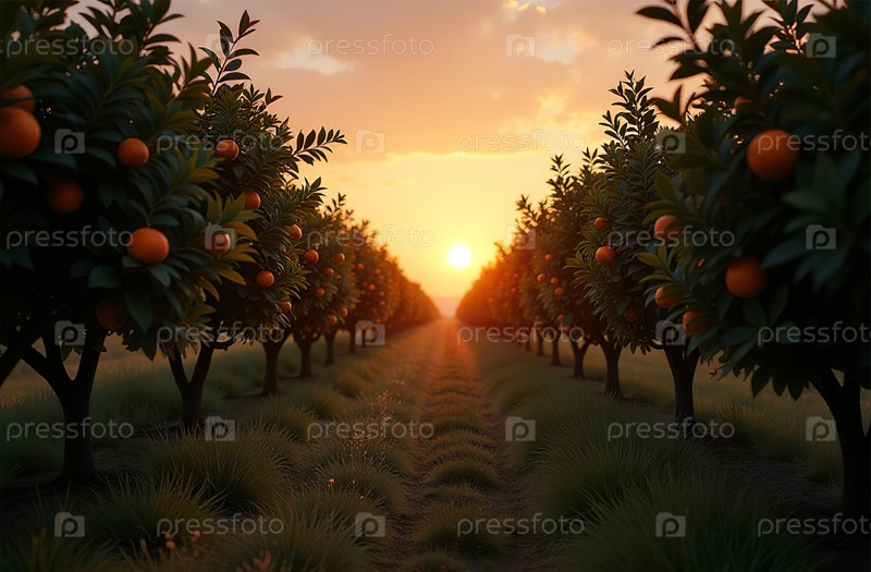 Большой сад апельсиновых фруктов, ферма, саженцы, растения, сладкие фрукты. Генеративный искусственный интеллект