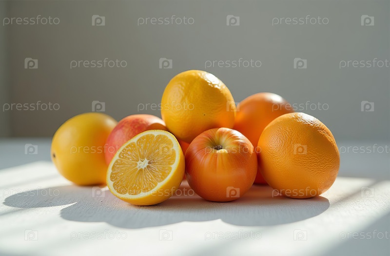 Натюрморт на столе, крупный план свежих фруктов, яркая кухня. Генеративный искусственный интеллект