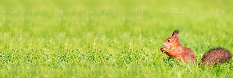 Рыжая пушистая белка стоит на задних лапках