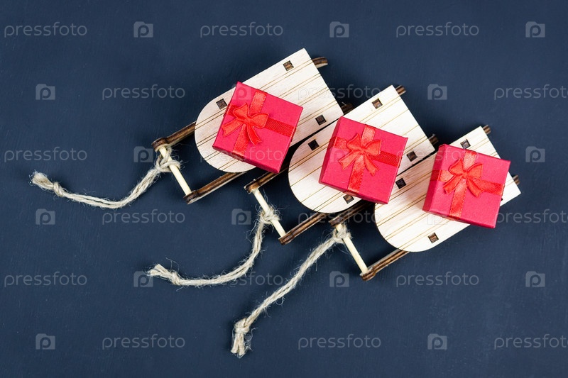 Сани с рождественскими подарками на черном фоне