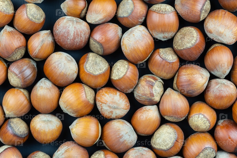 Фундук на черном фоне. Свежий урожай фундука разбросан на черном столе