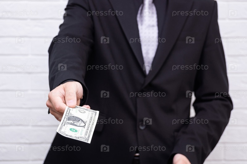 Мужчина с купюрой в руках на белом фоне