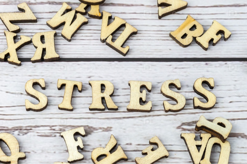 Слово "Стресс" состоит из деревянных букв на сером фоне. Минималистичная концепция. Плоский макет, вид сверху