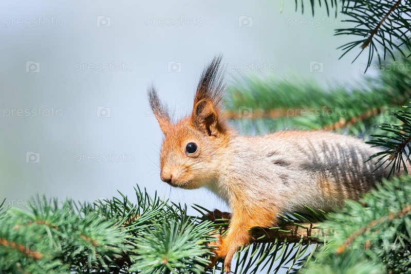 Орехообразная белка сидит на ветке весной или летом.Портрет белки в крупном плане.Евразийская красная белка, Sciurus vulgaris