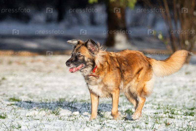 Симпатичная рыжая с белым собака дворняга на зимнем фоне