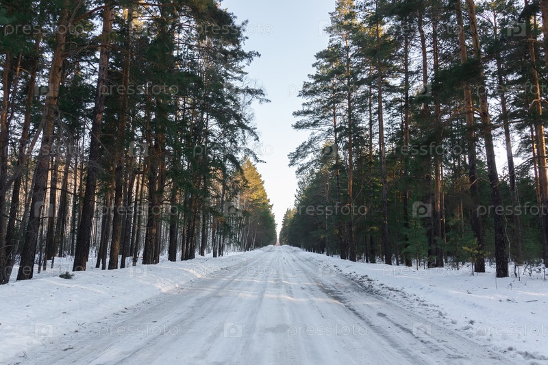 Дорога в России лес с покрытым снегом. Зимнее время. Пейзаж