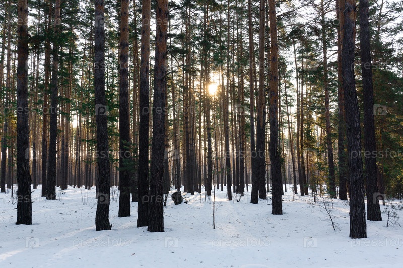 Зимний пейзаж с сосновым лесом, покрытым белым снегом. Выборочный фокус