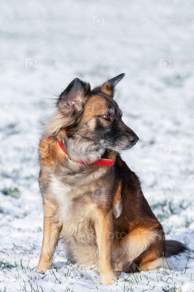 Симпатичная рыжая с белым собака дворняга на зимнем фоне