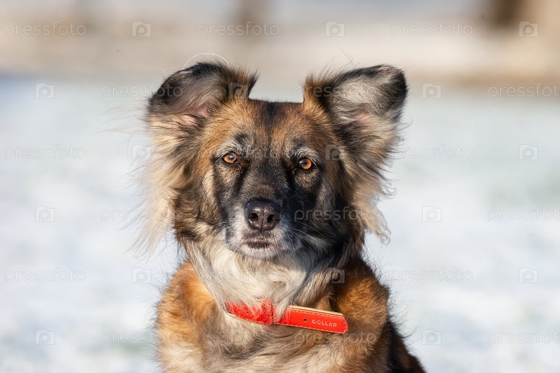 Симпатичная рыжая с белым собака дворняга на зимнем фоне