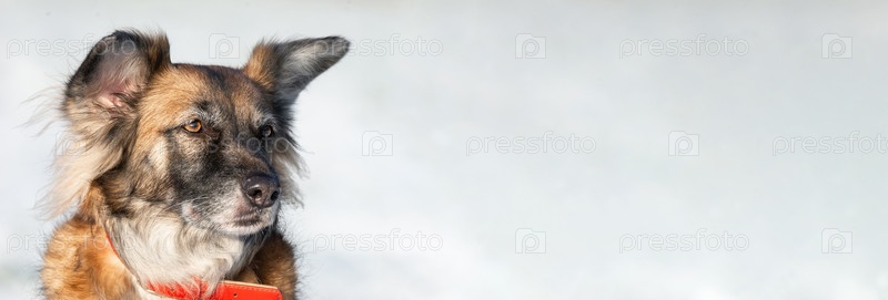 Симпатичная рыжая с белым собака дворняга на зимнем фоне