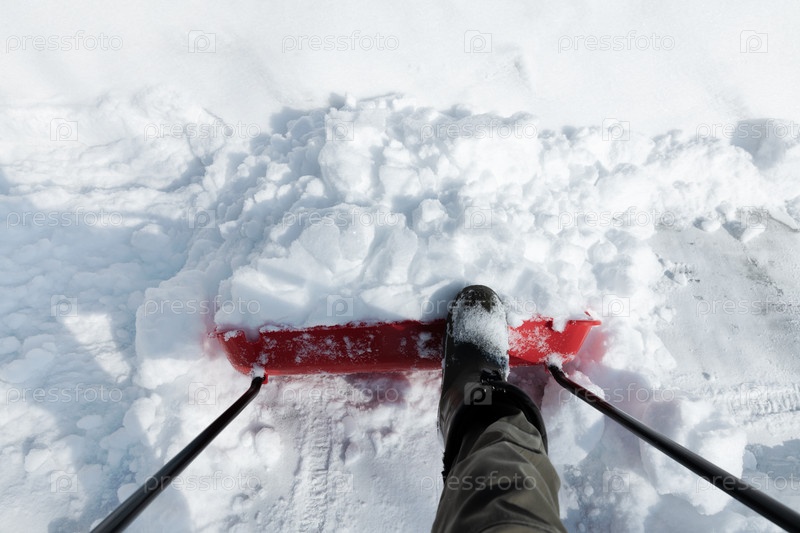 Уборка свежего снега большой лопатой после снегопада. Зимняя работа с профессиональным скрепером во дворе. Дворник за работой