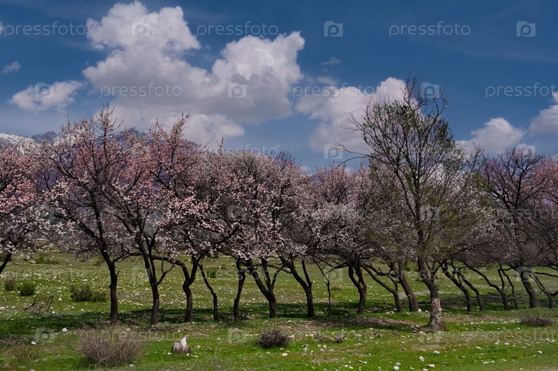 Кыргызстан. Вид на цветущие абрикосовые деревья в горных долинах вдоль шоссе Бишкек - озеро Иссык-Куль