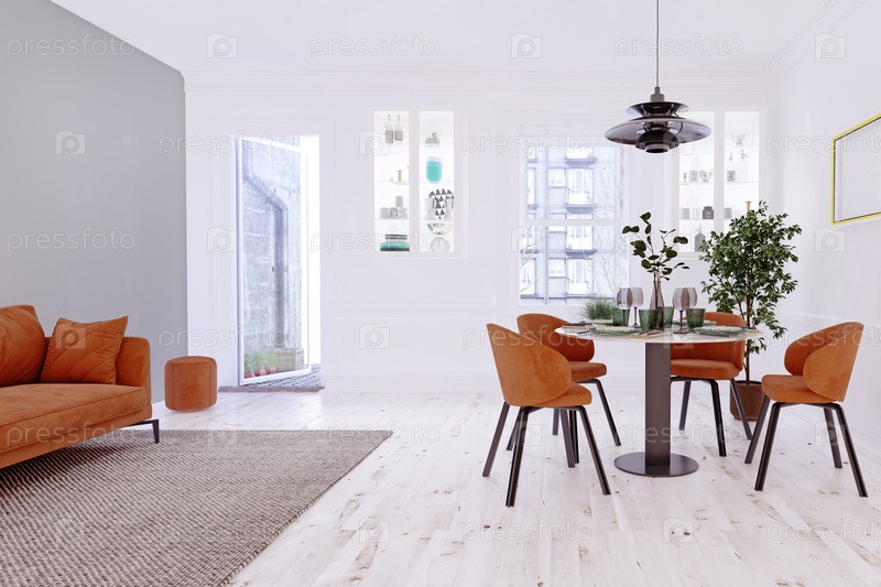 Современная гостиная с коричневым диваном, зеленой стеной, обеденной зоной, деревянными полами, естественным освещением и минималистическим декором. 3D-рендеринг