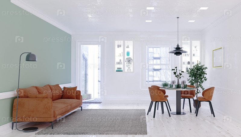 Современная гостиная с коричневым диваном, зеленой стеной, обеденной зоной, деревянными полами, естественным освещением и минималистическим декором. 3D-рендеринг