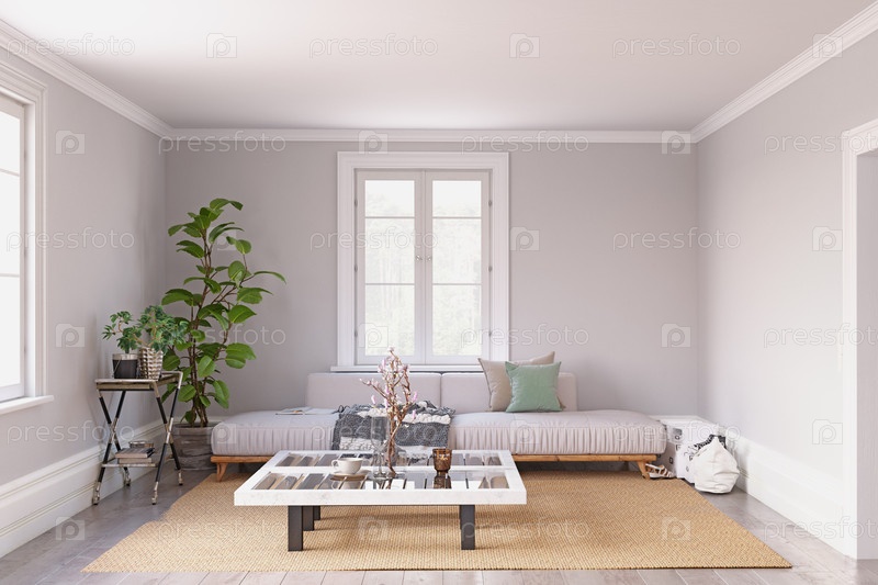 Современная гостиная с серым диваном и деревянным столом