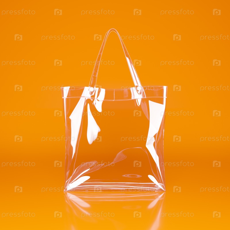 Прозрачная сумка-тоут с белыми ручками и белой лентой на оранжевом фоне. 3D-рендеринг