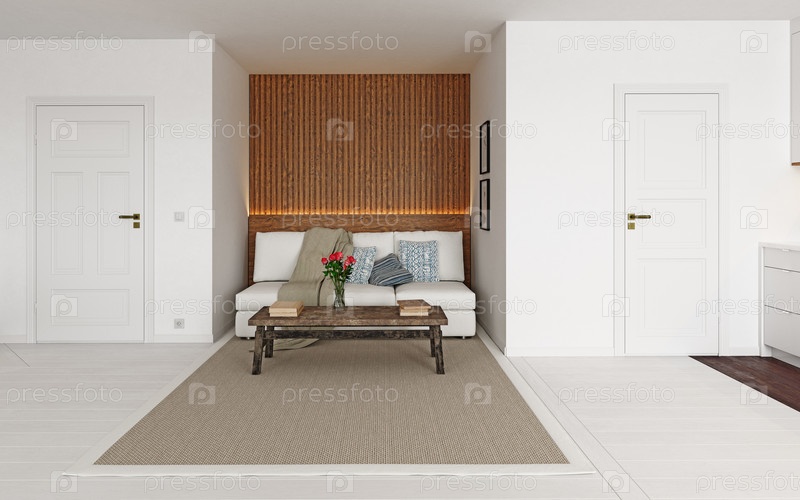 Минималистическая гостиная с деревянной акцентной стеной и мягким освещением. 3D-рендеринг