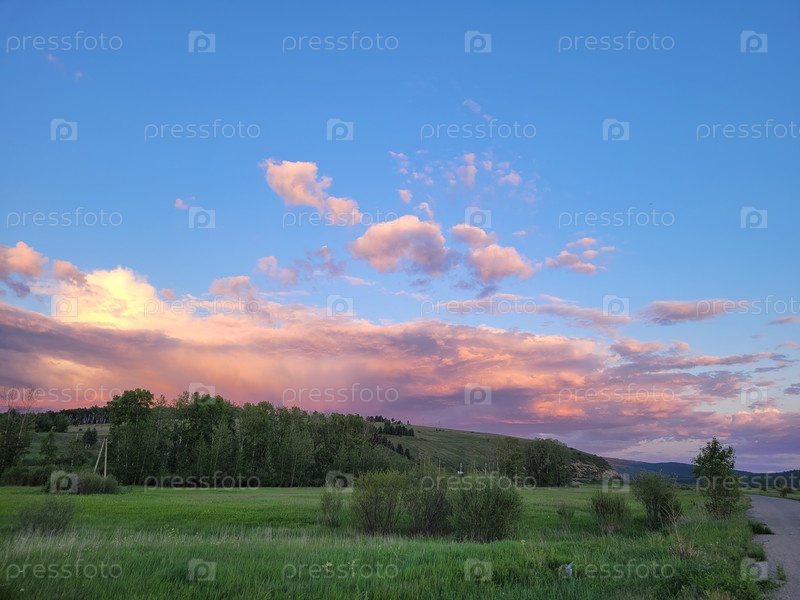 Зеленая лужайка и дорога на закате на фоне голубого неба и розовых облаков