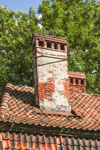 Кирпичные трубы на черепичной крыше старого дома, зеленое дерево и фон голубого неба