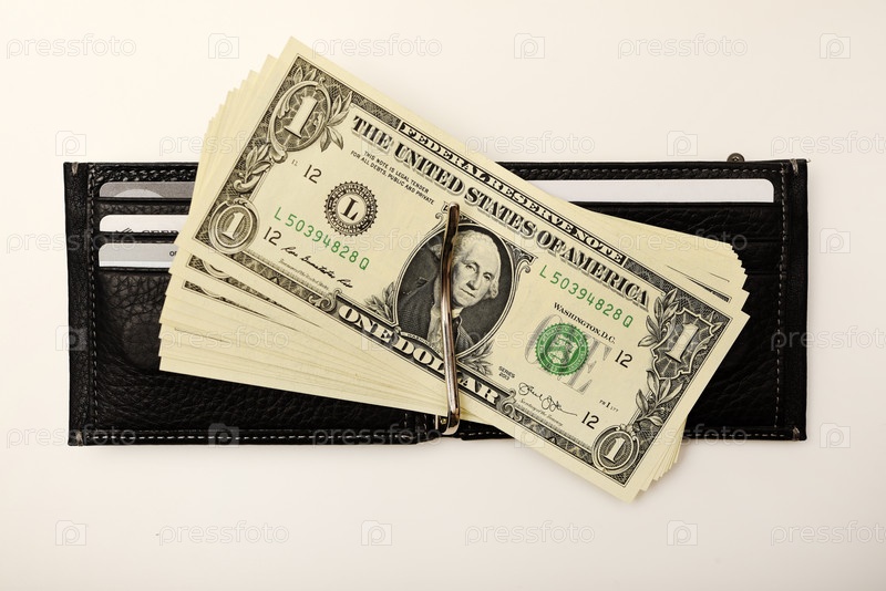 Черный кошелек с долларами на белом фоне. Кошелек с деньгами