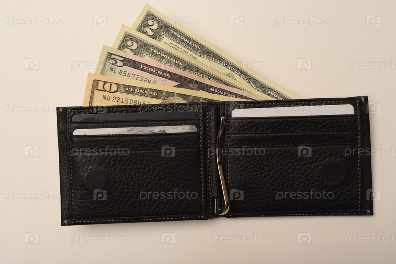 Черный кошелек с долларами на белом фоне. Кошелек с деньгами