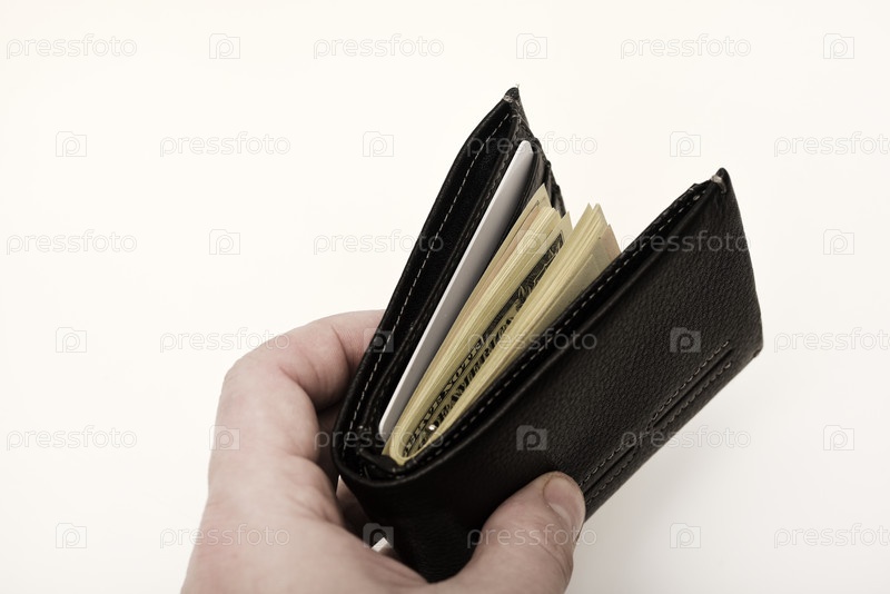 Черный кошелек с долларами на белом фоне. Кошелек с деньгами