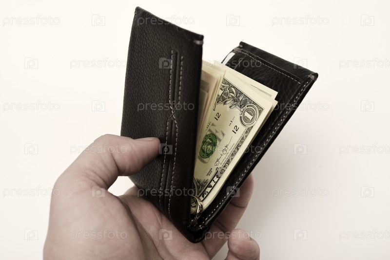 Черный кошелек с долларами на белом фоне. Кошелек с деньгами