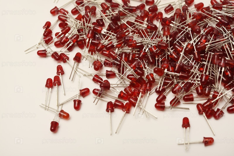 Красные светодиодные лампочки на белом фоне. Радиоэлемент — светодиодная лампа