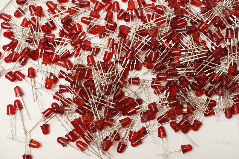 Красные светодиодные лампочки на белом фоне. Радиоэлемент — светодиодная лампа
