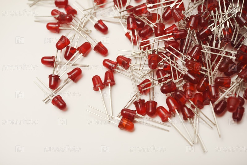Красные светодиодные лампочки на белом фоне. Радиоэлемент — светодиодная лампа