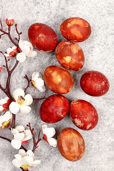 Мраморные пасхальные яйца, расписанные луковой шелухой на сером бетонном фоне с ветвями сакуры, идеи для домашнего приготовления пасхальных блюд, концепция празднования Пасхи