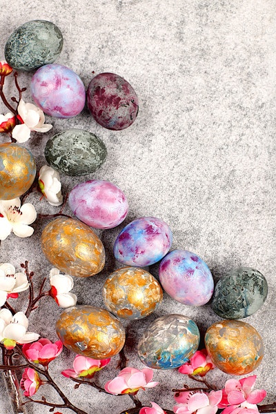 Мраморные пасхальные яйца, окрашенные золотой куркумой и чаем из гибискуса на сером бетонном фоне с ветвями сакуры, идеи для домашнего приготовления пасхальных блюд, концепция празднования Пасхи