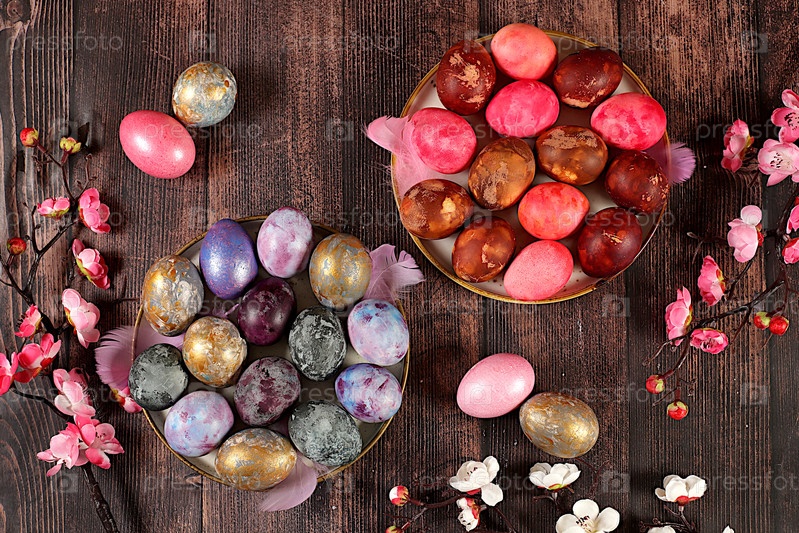 Концепция празднования Пасхи, мраморные пасхальные яйца, расписанные луковой шелухой, чай гибискус и розовый матча на деревянном фоне с ветвями сакуры, идеи для домашнего приготовления пасхальных блюд