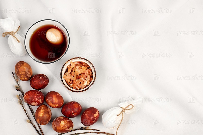 Концепция празднования Пасхи. Рецепт покраски пасхальных яиц натуральными красителями, идеи для домашнего приготовления к Пасхе. Мраморные яйца, окрашенные луковой шелухой, Светлый элегантный фон
