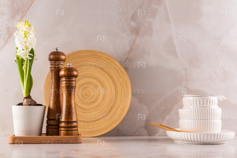 Фон кухни в стиле минимализма. Две деревянные мельницы для специй и белая керамическая посуда на бежевой мраморной столешнице. Весенние цветы в горшке