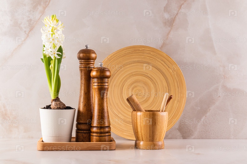 Красивый минималистский кухонный фон с набором кухонных принадлежностей и цветущим весенним цветком в горшке. Вид спереди. Экологичная кухня